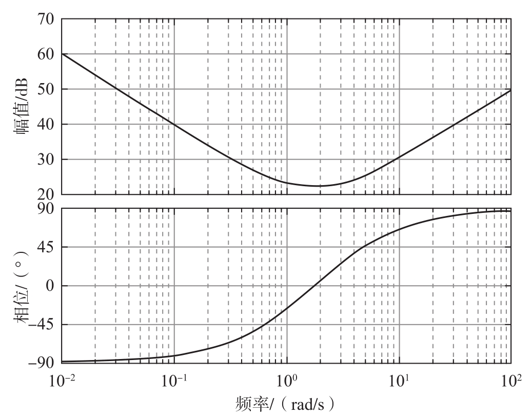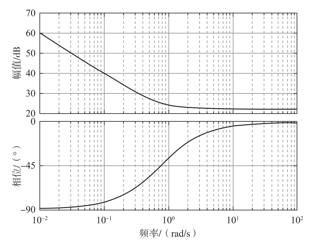 利用PID控制器对系统进行校正,可以使系统的稳态速度误差 e ssv ≤0.1,相位裕度 γ ≥67 ° ,截止频率 ω c ≥13.6rad/s。系统未加PID控制系统的伯德图如图2-13所示。