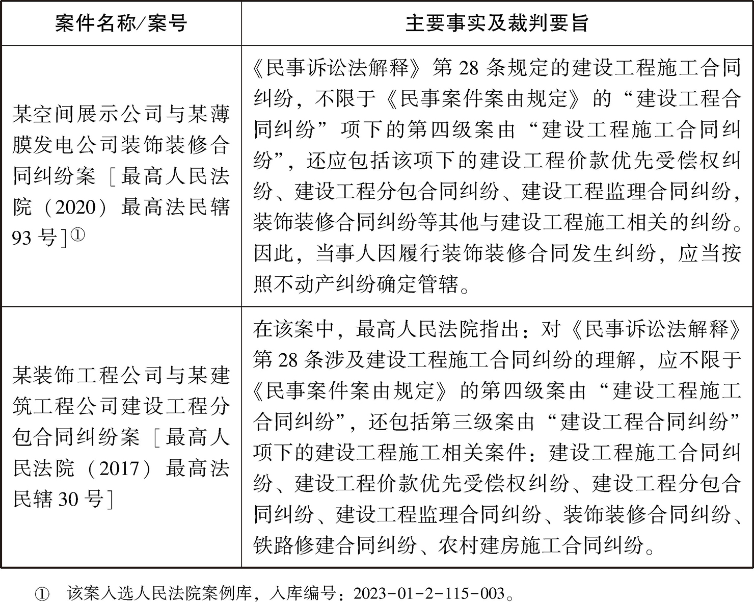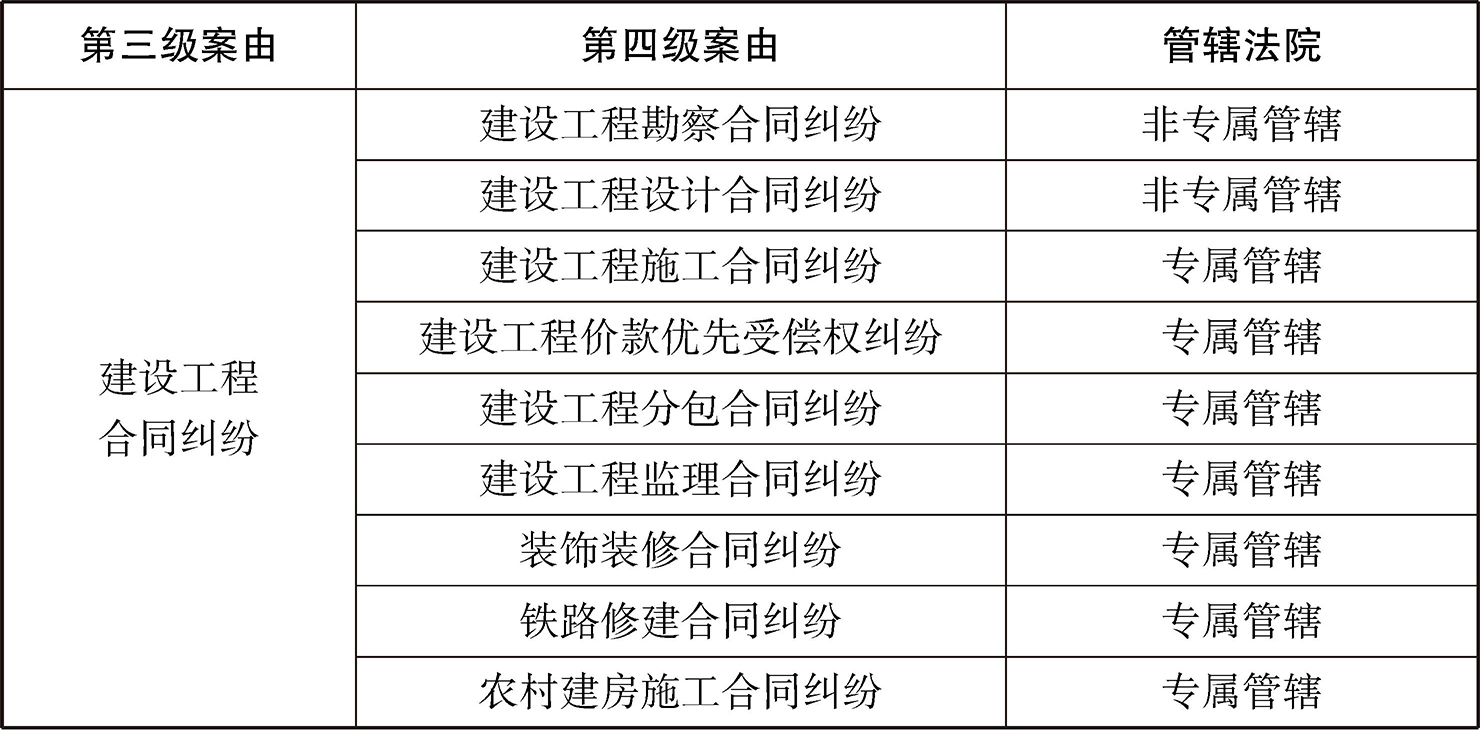 根据《民事案件案由规定》,“建设工程施工合同纠纷”是第三级案由“建设工程合同纠纷”下的第四级案由,与建设工程施工合同纠纷并列的第四级案由还有“建设工程勘察合同纠纷”“建设工程设计合同纠纷”,以及“建设工程价款优先受偿权纠纷”等9个类别。按照最高人民法院的意见,专属管辖原则上适用于“建设工程施工合同纠纷”和“建设工程价款优先受偿权纠纷”等与建设工程施工合同相关的纠纷。究其原因,盖因“建设工程价款优先受偿权纠纷”等虽是与“建设工程施工合同纠纷”并列的第四级案由,但其或与施工紧密关联(如工程价款优先受偿、工程监理),或为施工合同的特殊类型(如装饰装修、铁路修建),故其管辖应与建设工程施工合同纠纷一致。