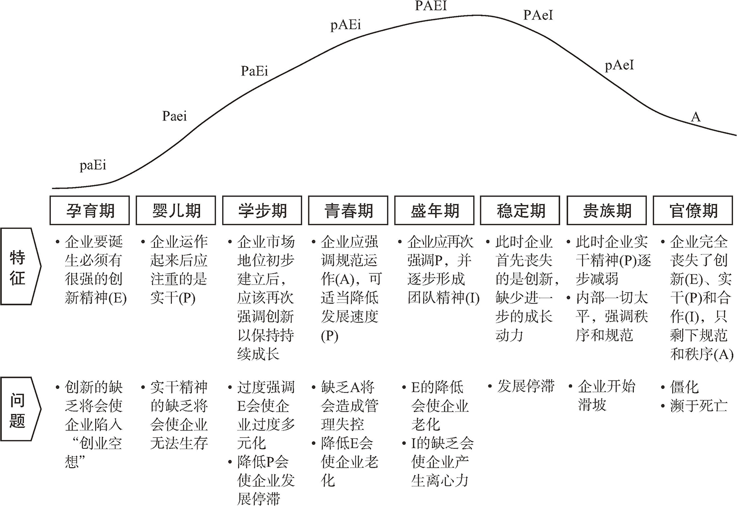 这四个因素可以简称为PAEI,它们共同作用,推动企业在生命周期中前进。PAEI在生命周期各阶段有着不同的分布,在某一阶段会突出其中的某些因素,如图1-3所示。