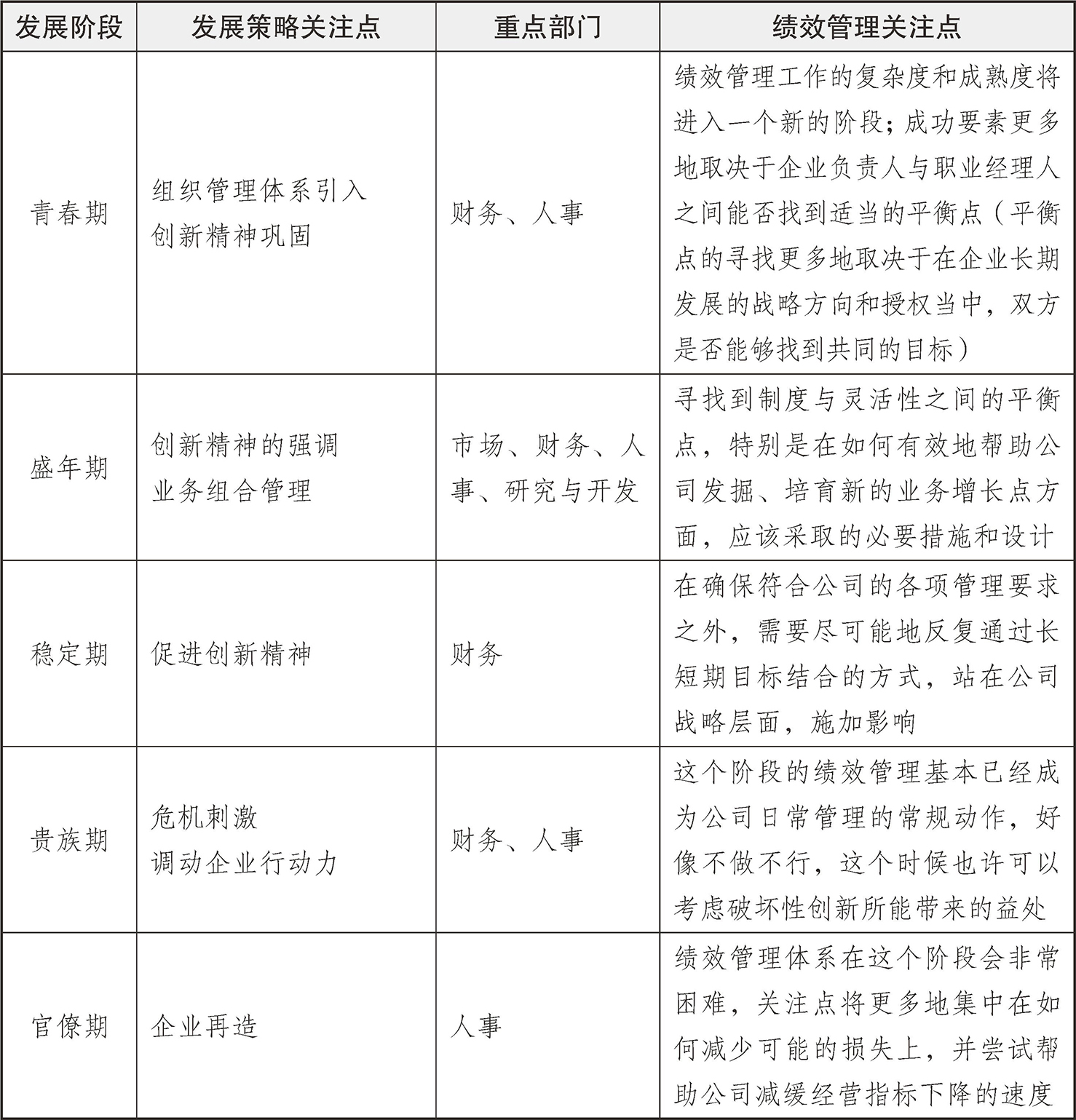 说到公司的动态战略发展与绩效管理,必须关注企业的生命周期。同生物界的生命周期相似,企业行为也经历着从成长到衰退的过程。我们首先来看不同发展阶段的企业通常的特点和面临的风险,如图1-2所示。