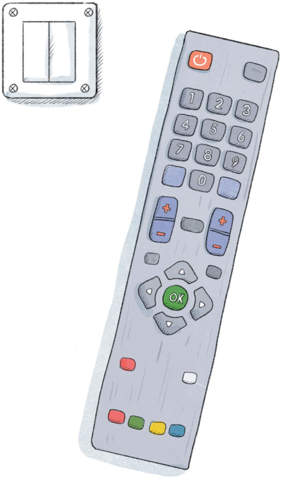 遥控器上有很多按钮。找找看,家里还有其他按钮吗?它们都长什么样?有什么作用?