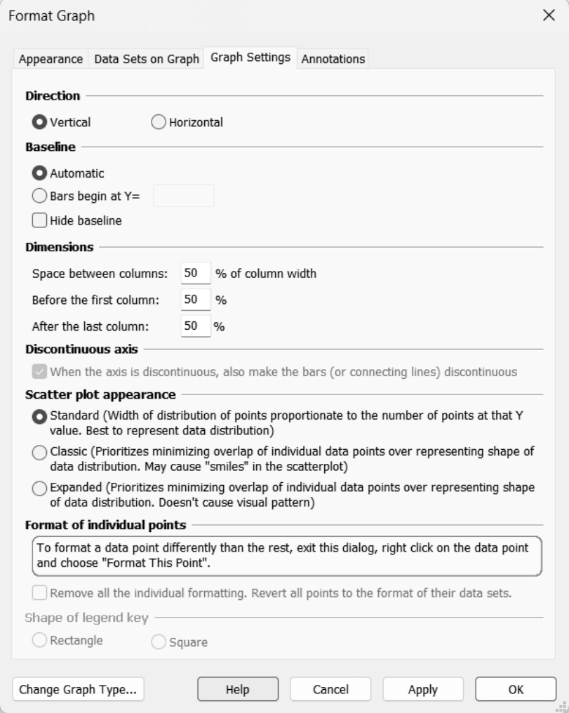 Graph Settings选项卡如图1.13所示。其中:Direction选项用于设置图形的方向,默认是垂直(Vertical);Baseline选项用于设置图形的起始位置,一般保持默认;Dimensions选项用于设置柱形图的间隔,包括柱形图间的间隔、第一个柱形图前间隔、最后一个柱形图后的间隔;Scatter plot appearance选项用于设置散点的外观。