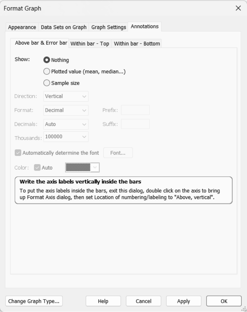 Annotations选项卡如图1.14所示。Annotations选项卡可以在图形上添加统计量,如自动添加平均值、样本量等,此处一般设置为不添加任何统计量,即将Show选项设置为Nothing。
