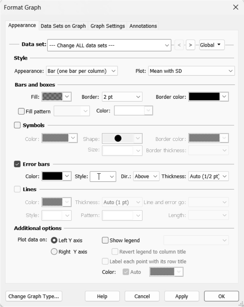 □ Style系列选项中的Appearance选项用来设置绘制的图形类型,可以是散点图(Scatter dot plot)、条形图(Bar)、小提琴图(Violin plot)和箱式图(Box and whiskers)等;Plot选项用来设置绘制哪些统计量。比如均数±标准差(Mean with SD)、均数±标准误(Mean with SEM)等。