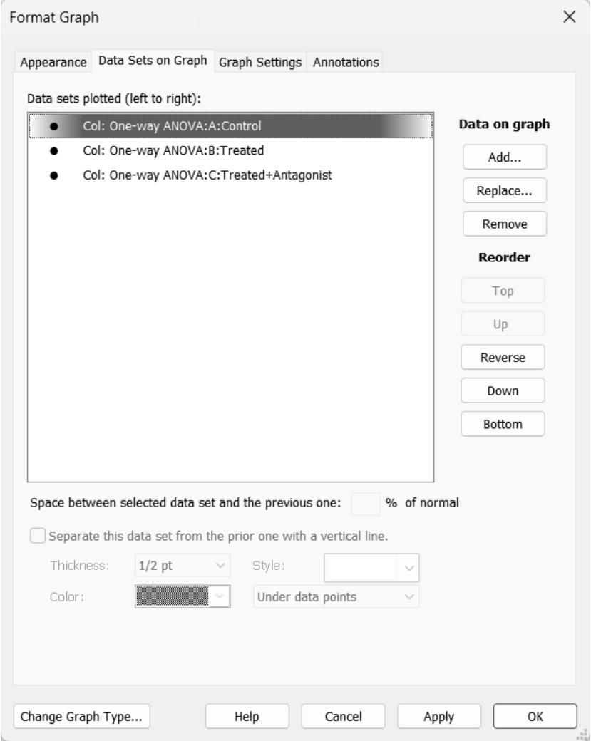 Data Sets on Graph选项卡如图1.12所示。Data Sets on Graph选项卡允许用户管理和调整图表上不同列的数据,以此来绘制图形。其中:Data on Graph系列选项用于列数据的添加、替换、删除;Reorder系列选项用于列数据的顺序调整。