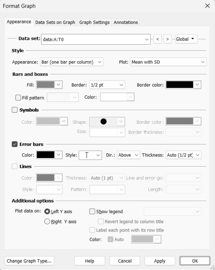 □ 在Error bars系列选项中,在Color选项中设置误差线的颜色为黑色,在Style选项中设置误差线的类型为T型,在Dir选项中设置误差线的方向为Above即上方,在Thickness选项中设置误差线的粗细为1/2pt。