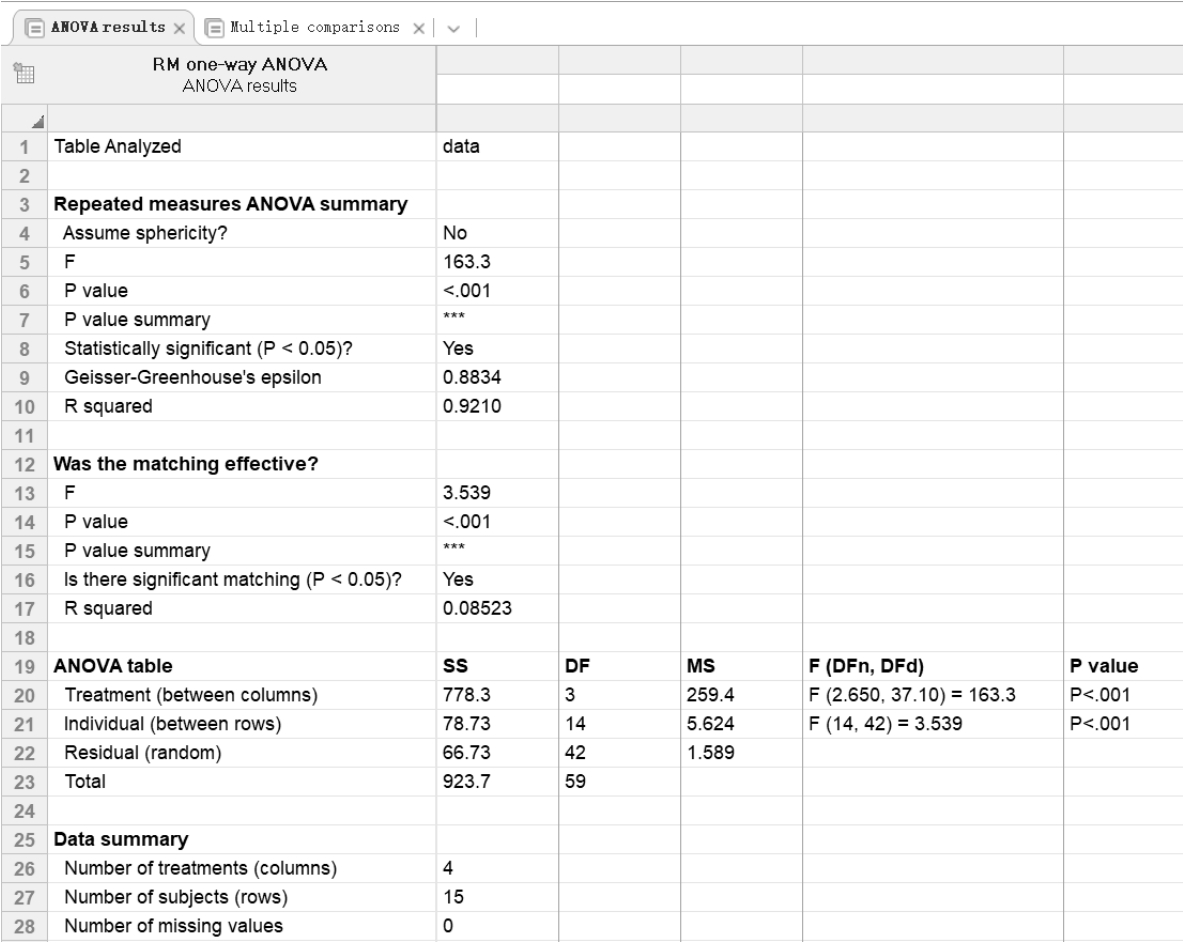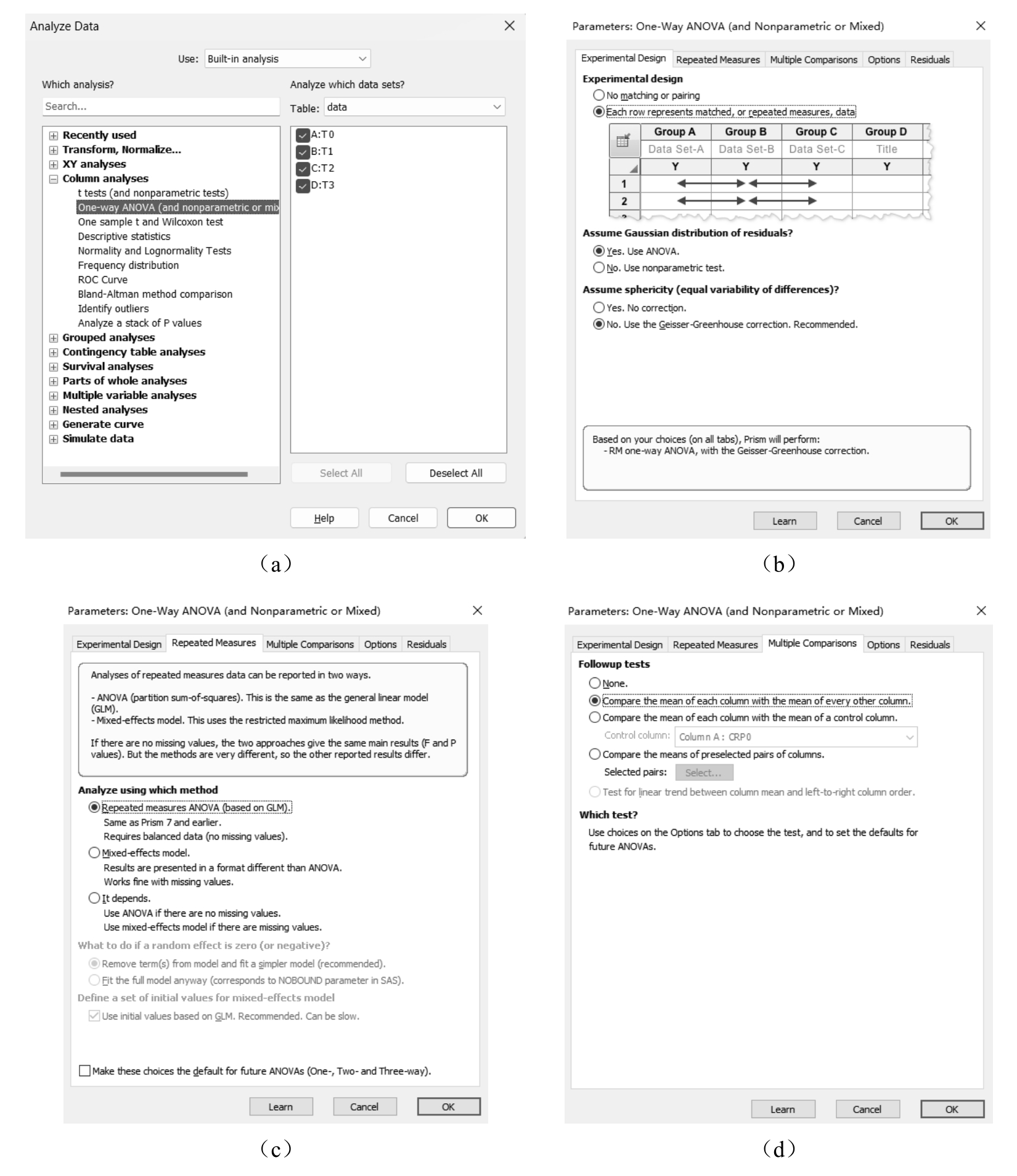 在Experimental Design选项卡中的Experimental design下选择Each row represents matched, or repeated measures, data单选按钮,表示每一行为不同时间点的数据。因正态性检验已经通过,所以在Assume Gaussian distribution of residuals中选择Yes, Use ANOVA单选按钮。在Assume sphericity(equal variability of differences)球形假设检验下选择No. Use the Geisser-Greenhouse correction. Recommend单选按钮,即先假定各组数据为非球形,采用Geisser-Greenhouse校正方法计算,具体是否满足球形假设还需要查看后续的分析结果。