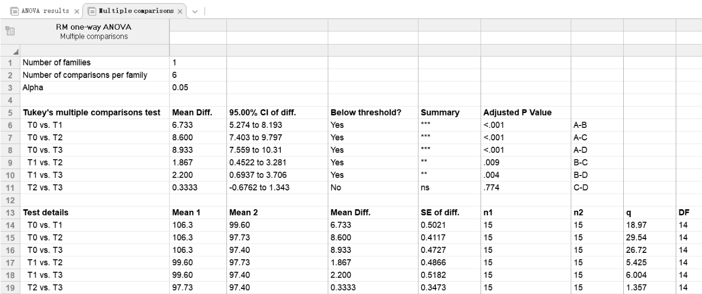 单因素重复方差分析仅考虑一个时间因素的影响。在实际研究中,可能存在其他潜在的影响因素或协变量。因此,在单因素重复测量方差分析的结果解释时应谨慎。关于多重比较的注意事项见2.3节。