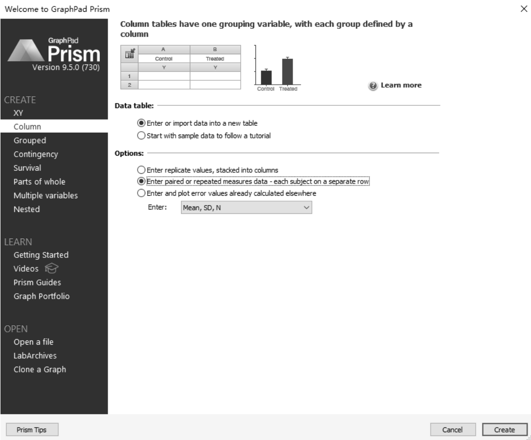(1)打开GraphPad Prism软件,如图2.35所示,在CREATE下选择Column选项。