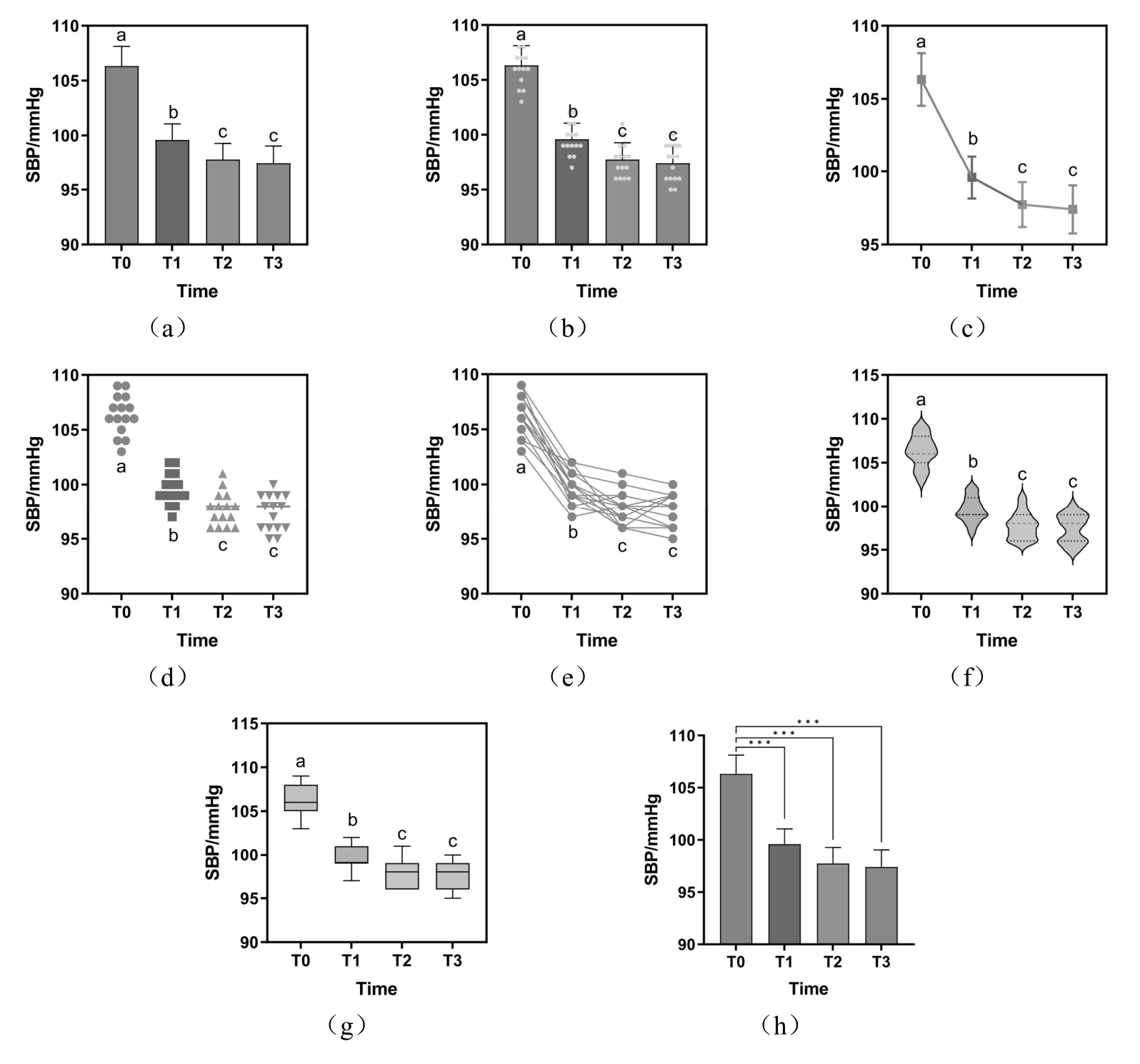 注意: 针对时间点较多的图形,建议使用字母法添加显著性标记,不推荐使用图示法添加显著性标记,否则图形会比较凌乱。另外,在进行两两比较时,也可以只与T0比较,此时可用图示法标记显著性,如图2.46(h)所示。