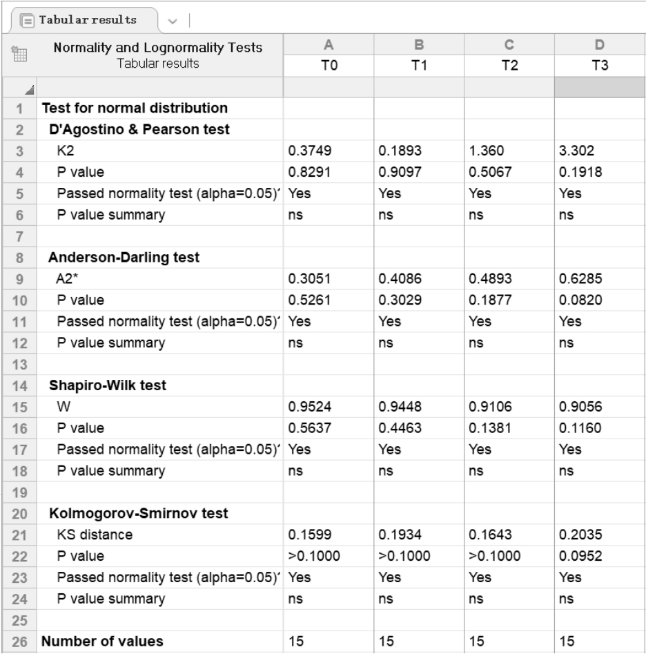 正态性检验结果如图2.38所示,本例样本量为15,为小样本(样本量<50),因此选择Shapiro-Wilk(S-W)检验的效能更高。本例查看S-W检验结果, P 值均大于0.1,提示本例4组数据均服从正态分布。
