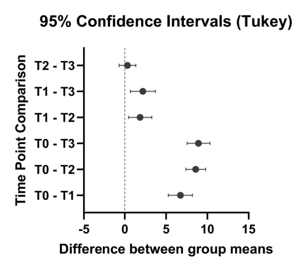 □ 多重比较结果如图2.41所示,T0和T1之间舒张压的差值及其置信区间为6.733(5.274~8.193),差异有统计学意义( P <0.001),另外T0~T2间、T0~T3间、T1~T2、T1~T3间舒张压亦存在显著性差异,而T2~T3间舒张压不存在差异,详细结果略。
