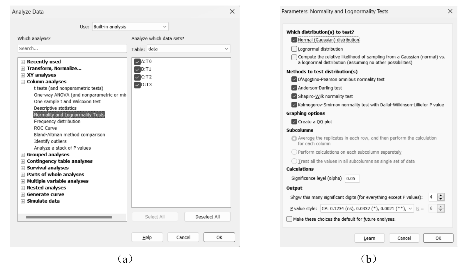 按钮,弹出的对话框如图2.37(a)所示,选择Column analyses下的Normality and Lognormaity Tests选项,其他保持默认,单击OK按钮,弹出的对话框如图2.37(b)所示,保持默认设置,即采用4种正态性检验方法。