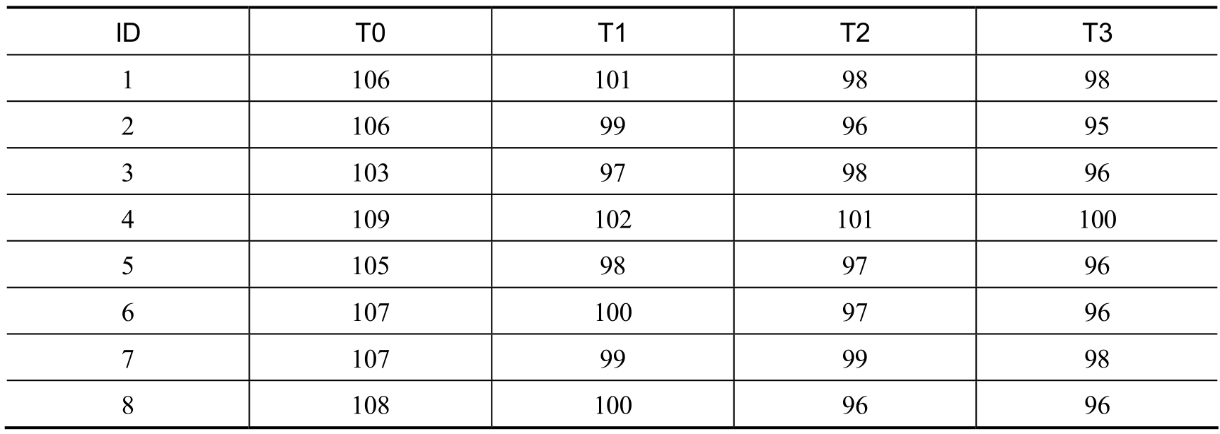 下面模拟一项研究,招募了15名研究对象,进行12个月的行为干预,共测量了4次舒张压,分别是干预前(T0)、干预后3个月(T1)、干预后6个月(T2)、干预后12个月(T3)。试问行为干预后舒张压是否存在显著性差异?数据如表2.4所示。