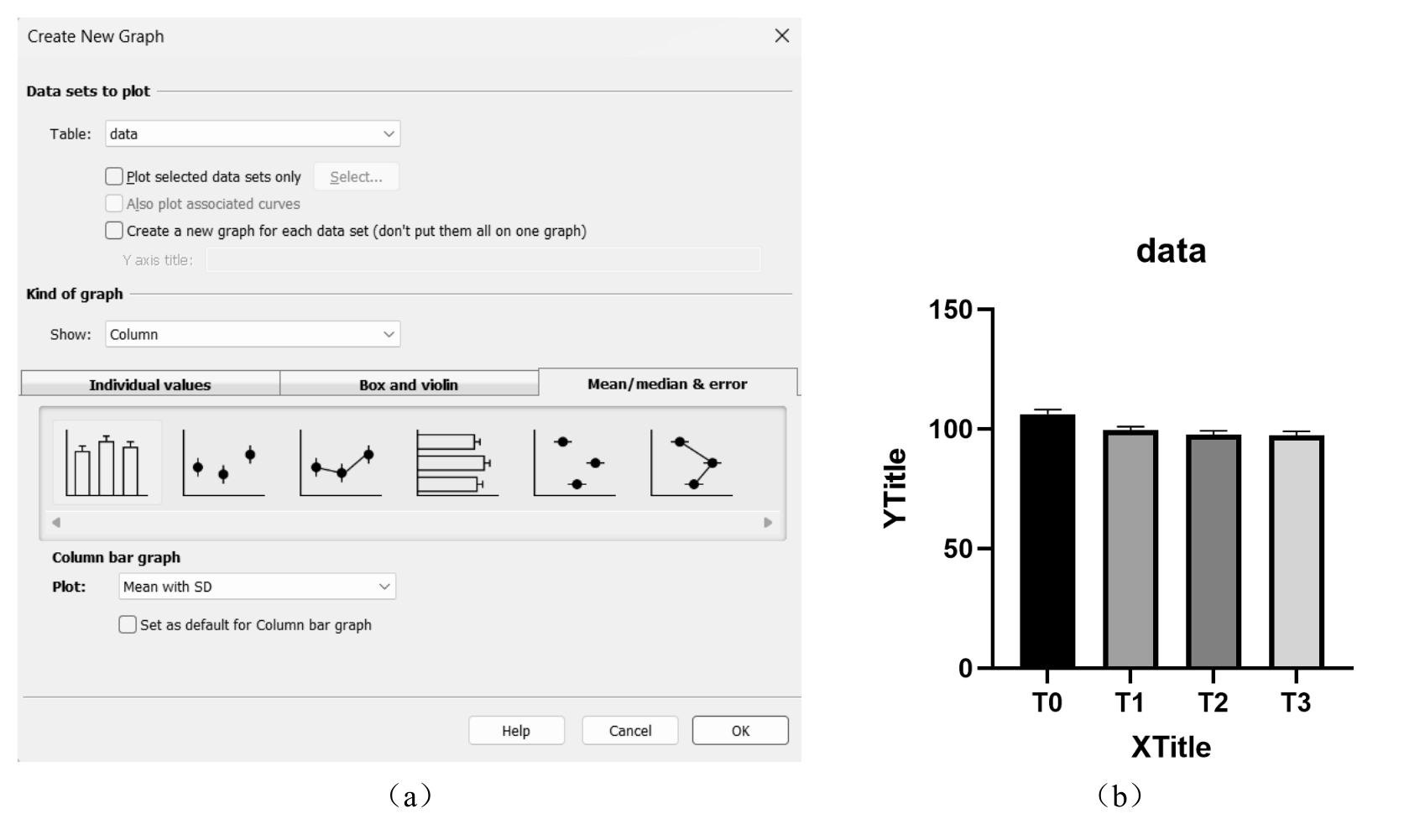 (1)单击图2.36导航栏Graphs下的New Graph,弹出的对话框如图2.42(a)所示,Table选项设置为data,Show选项设置为Column,选择Mean/median & error选项卡下的第1个图形,其他保持默认,单击OK按钮。生成的柱状图草图如图2.42(b)所示。