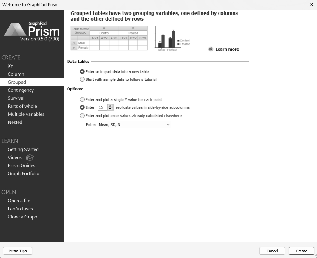(1)打开GraphPad Prism软件,如图2.57所示,在CREATE下选择Grouped选项。