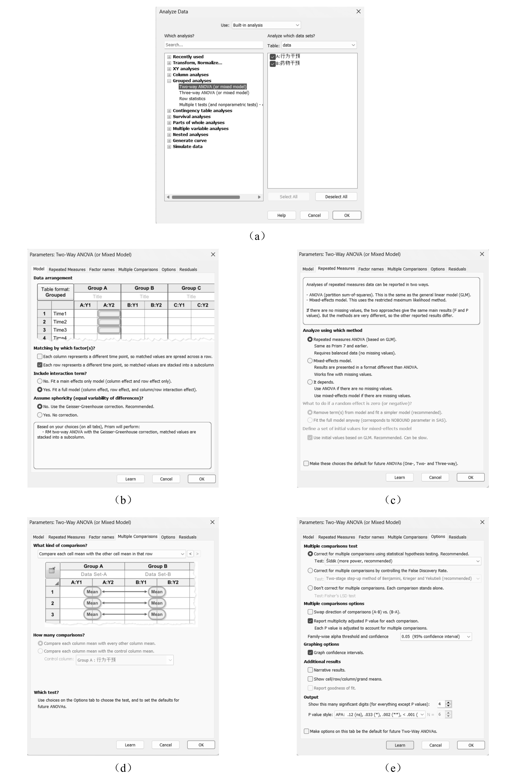 按钮,弹出的对话框如图2.59(a)所示。选择Grouped analyses下的Two-way ANOVA(or mixed model)选项,默认勾选A、B两列数据,单击OK按钮弹出新的对话框。