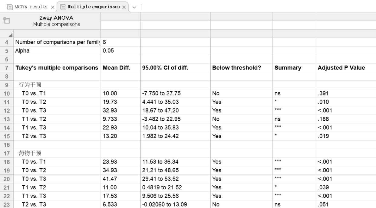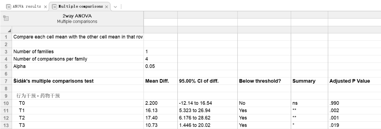 另一个方向上的多重比较如图2.62所示。罗列了各组4个时间点的两两比较。实现方法见配书视频。