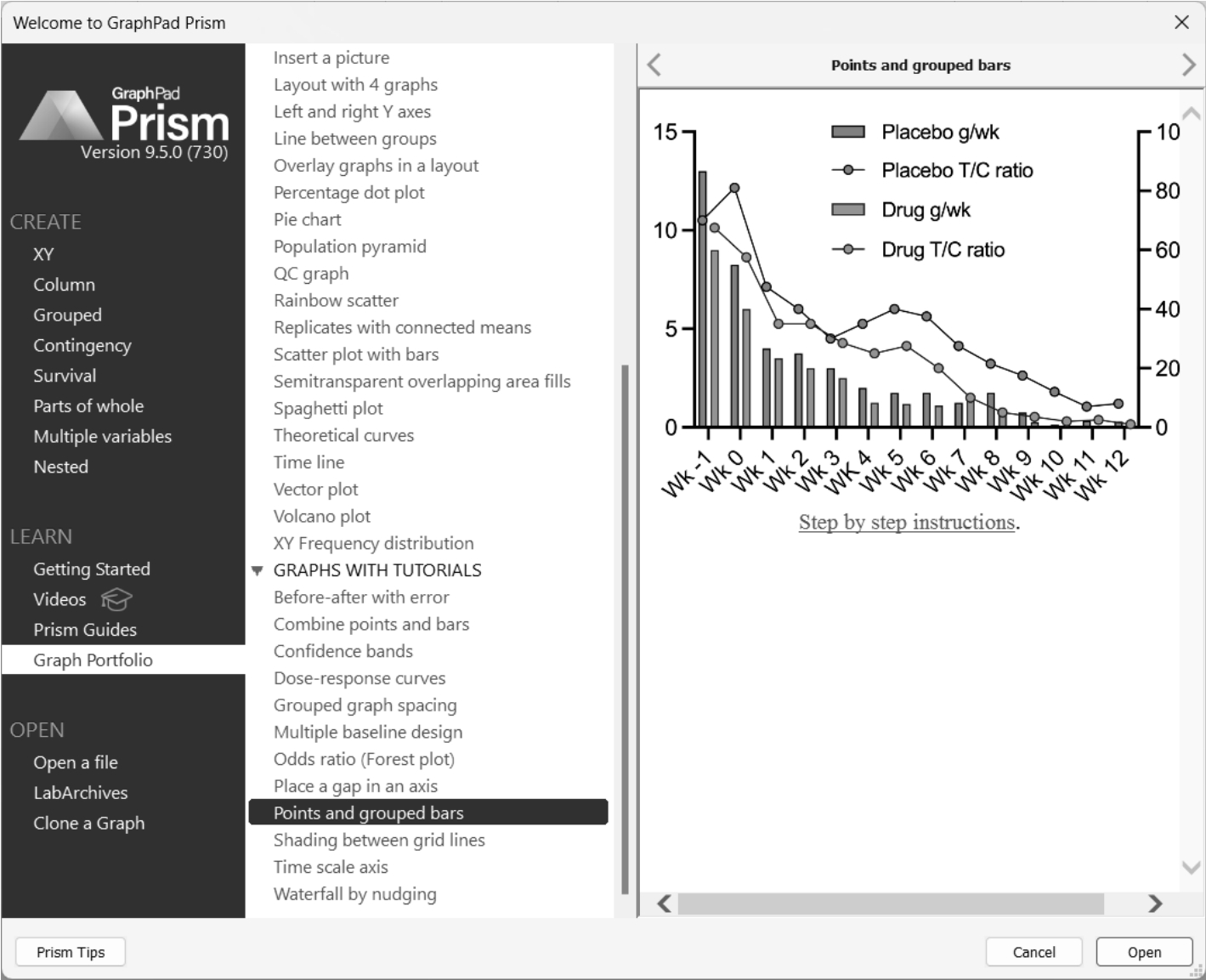 第三个菜单是OPEN菜单,其中,Open a file选项用于打开GraphPad Prism文件,LabArchives选项为实验室功能,Clone a Graph选项可以复制图形。
