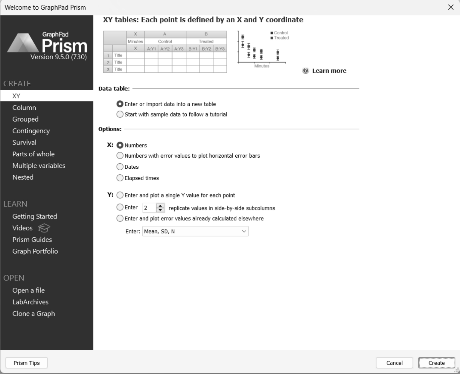首先介绍CREATE菜单,其使用最频繁。CREATE菜单可用来创建空白文件,从而进行数据录入、统计分析和图形绘制。CREATE菜单中共有8种数据表,分别是XY表、Column表(纵列表)、Grouped表(行列分组表)、Contingency表(列联表)、Survival表(生存表)、Parts of whole表(局部表)、Multiple variables表(多变量表)和Nested表(嵌套表),用户根据自身需要选择合适的数据表,单击Create按钮即完成空白文件的创建。在GraphPad Prism中绝大多数的统计、绘图需求均是利用这8个数据表完成的,而在这8个数据表中以XY表、Column表和Grouped表使用最频繁。下面逐一介绍此8个数据表功能。