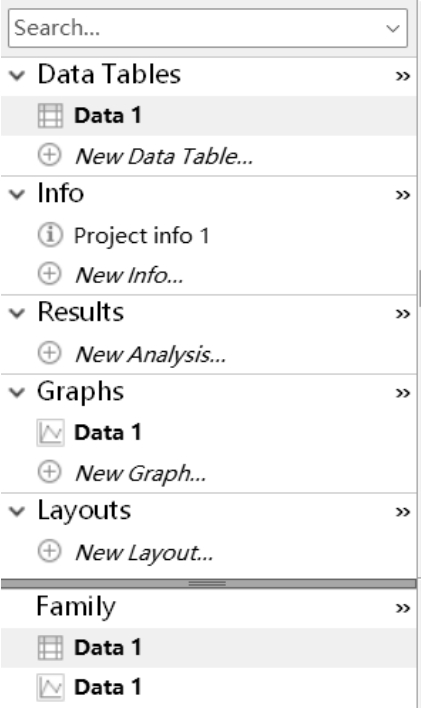 导航栏如图1.6所示。GraphPad Prism的导航栏是一个直观展现数据结构与图形的核心区域,用于快速访问和管理项目中的数据表、信息表、结果、图形、图形排版、簇。导航栏可以分为以下几个部分。