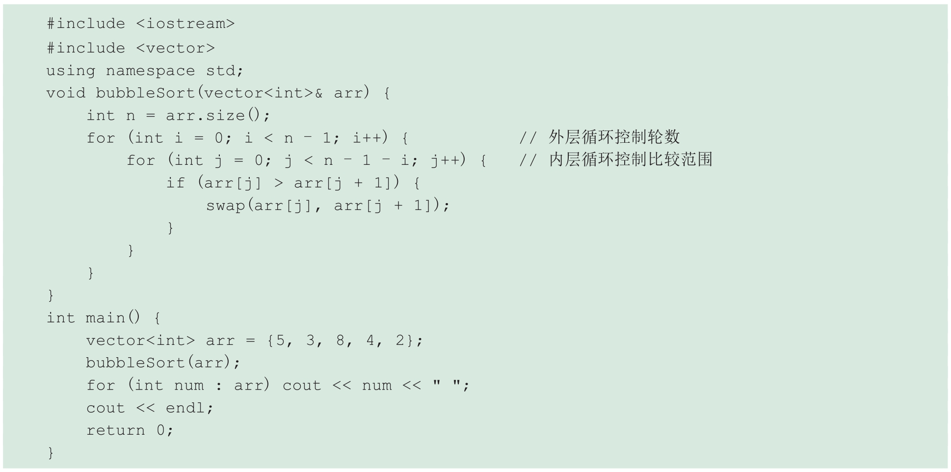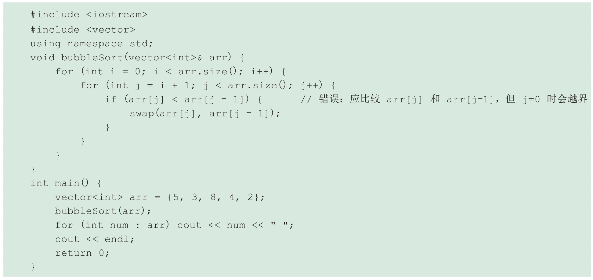 案例:一个学生在编写冒泡排序算法时遇到了问题。学生的代码如下: