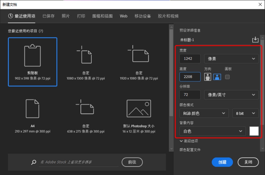 01 按下快捷键Ctrl+N新建文件,在“新建文档”对话框中,设置“宽度”为“1242像素”、“高度”为“2208像素”、“分辨率”为“72像素/英寸”(见图1.3.1)。这是目前较为常用的手机竖屏海报尺寸。单击“创建”按钮,创建“未标题-1”。