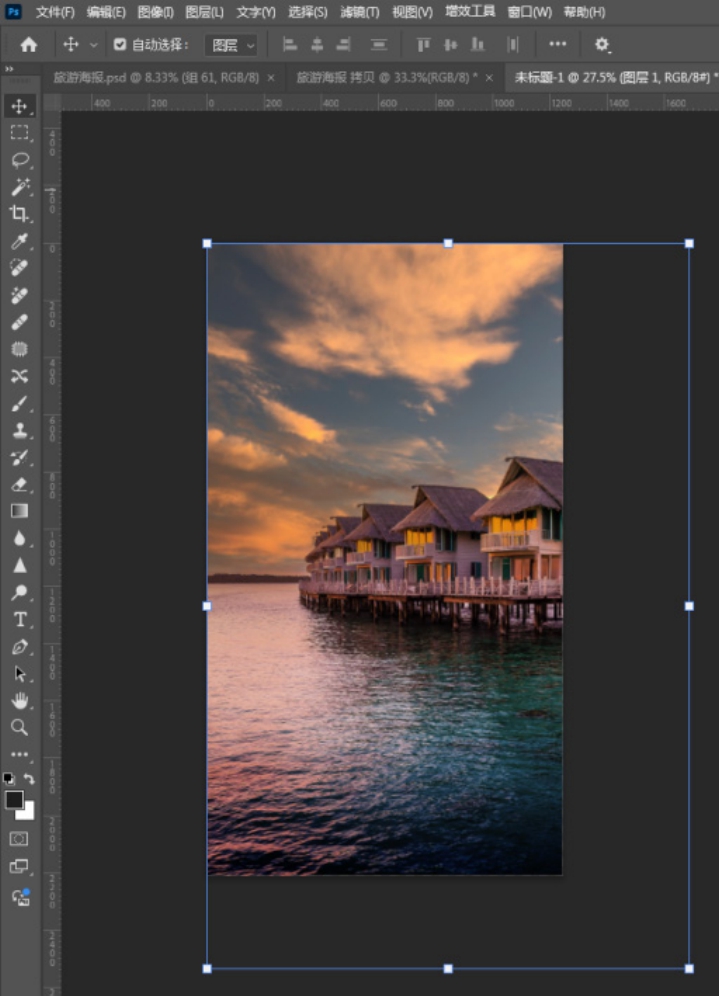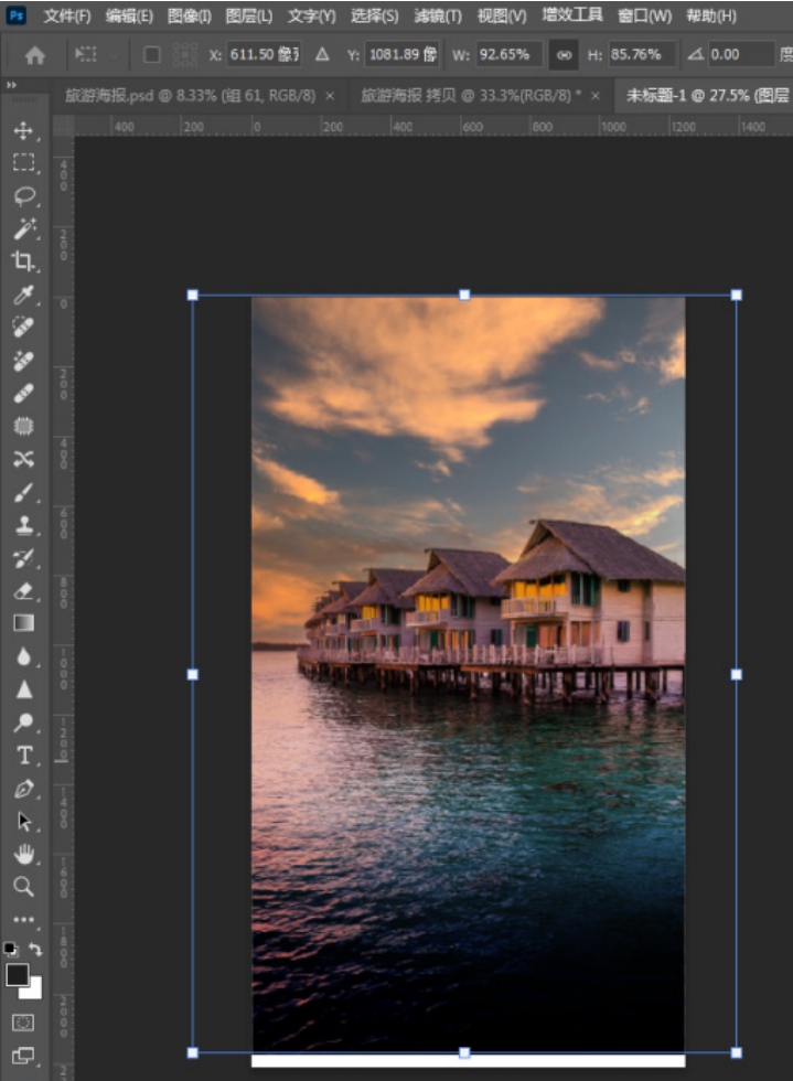 01 按下快捷键Ctrl+T,拖动定界框的4个角,缩小图像,最后按Enter键确定变换。
