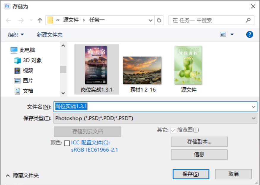 01 选择“文件”→“存储为”菜单命令,在弹出的对话框中,先选择保存位置,然后输入文件名“岗位实战1.3.1”,设置“保存类型”为Photoshop(*.PSD;*.PDD;*.PSDT),单击“保存”按钮(见图1.3.10)。