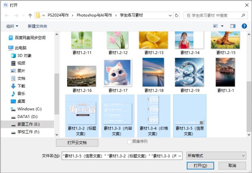 01 选择“文件”→“打开”菜单命令,按住Ctrl键依次单击“素材1.3-2(标题文案)”“素材1.3-3(内容文案)”“素材1.3-4(价格文案)”“素材1.3-5(信息文案)”,选中多个文档,单击“打开”按钮(见图1.3.7)。
