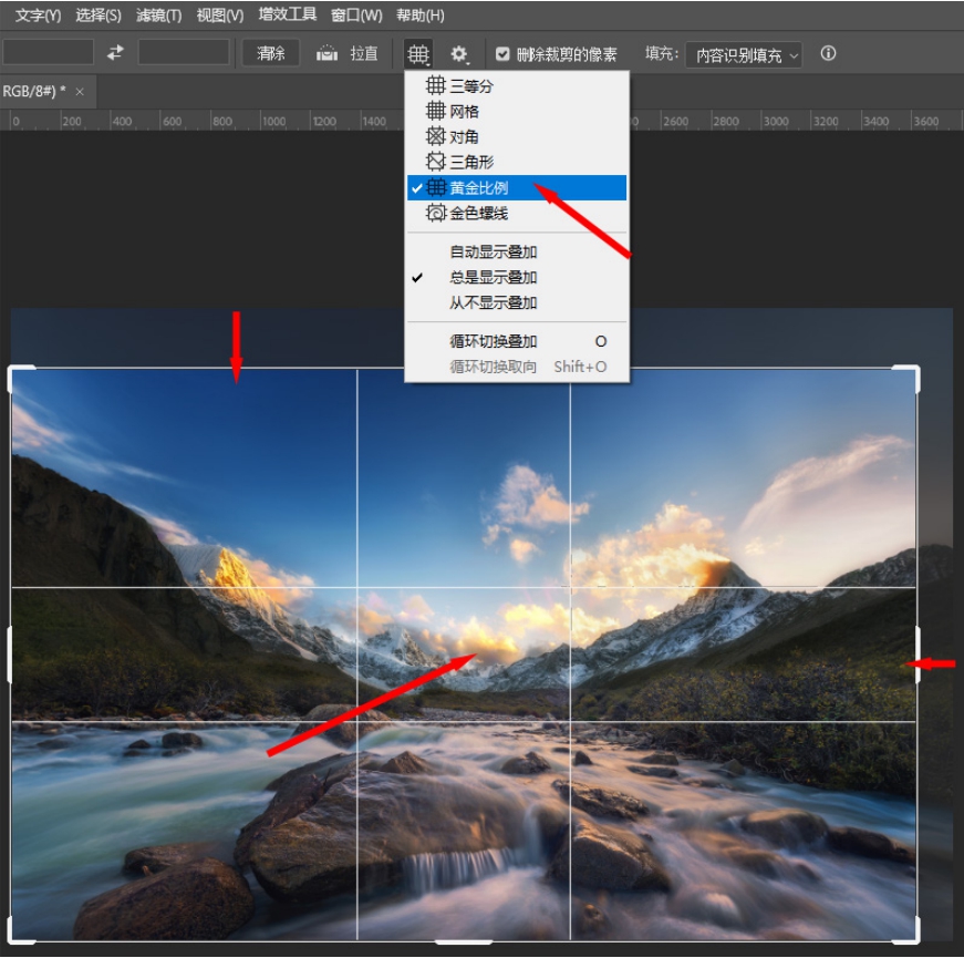 02 单击“裁剪工具”,单击上方裁剪工具选项栏中的“设置裁剪工具的叠加选项”按钮,选择“黄金比例”选项(见图1.3.14)。