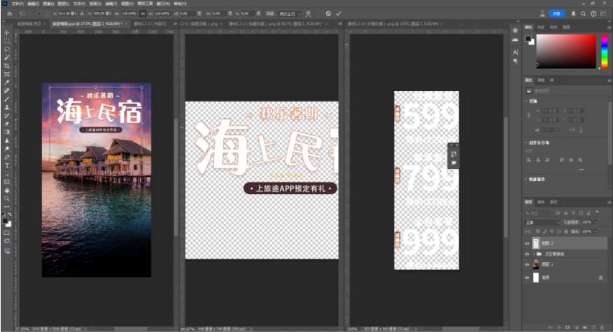 02 依次将打开的素材复制、粘贴入文档中,并按下快捷键Ctrl+T缩放至合适的大小,并移动到合适的位置(见图1.3.8)。