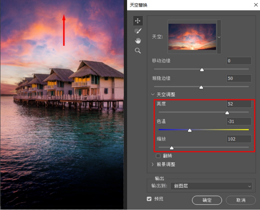 02 调节“天空替换”面板中的参数,在云彩部分向上拖动,使画面更亮(见图1.3.6)。