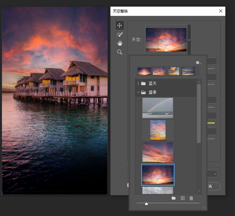 01 单击“编辑”→“天空替换”菜单命令,在弹出的对话框中选择“盛景”中第四个选项(见图1.3.5)。