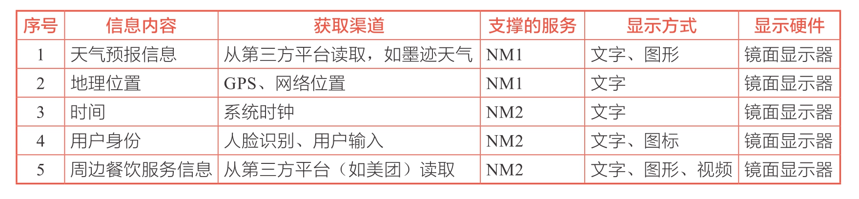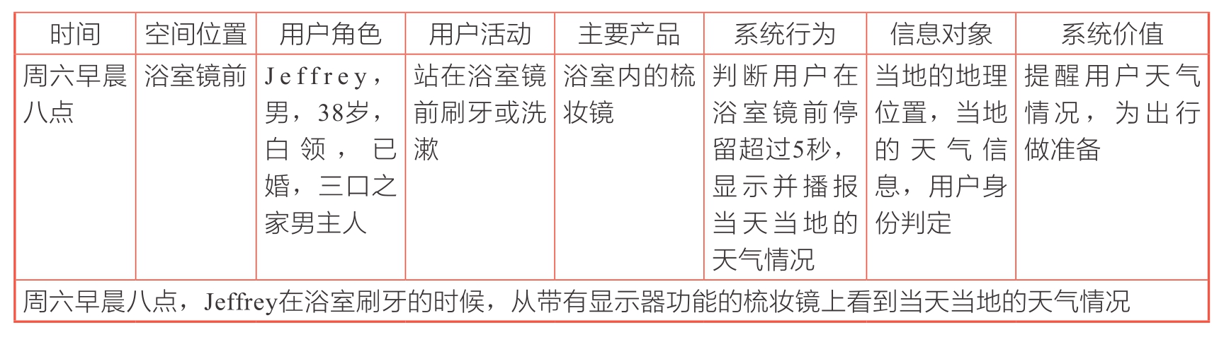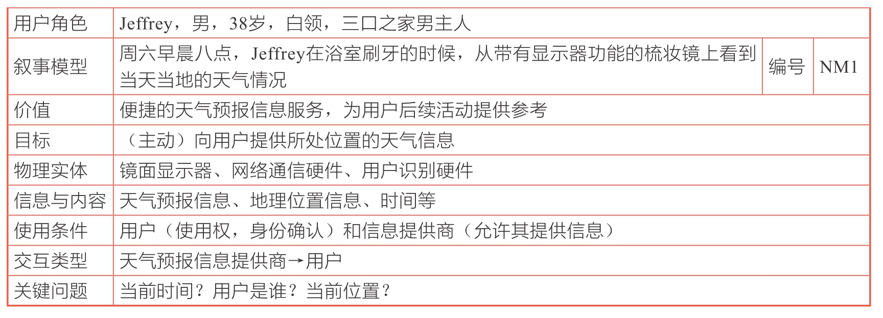 表2-4列出了为实现表2-1所示设计概念所需的信息内容资源及其初步的解决方案。此表主要用于系统交互设计师与后端的信息开发工程师、软件系统开发工程师以及后端的UI设计师进行沟通,确定相关情境信息与内容的获取方式和信息表现方式。需要注意的是,软件系统有较强的拓展灵活性,可以很容易地增加新的功能,需要在信息内容资源表中列出提供所有服务(叙事模型)相关的信息内容。例如,表2-4中的NM2对应的叙事模型是“周六早晨八点,Jeffrey在浴室刷牙的时候,从带有显示器功能的梳妆镜上看到系统推荐的周边美食”。