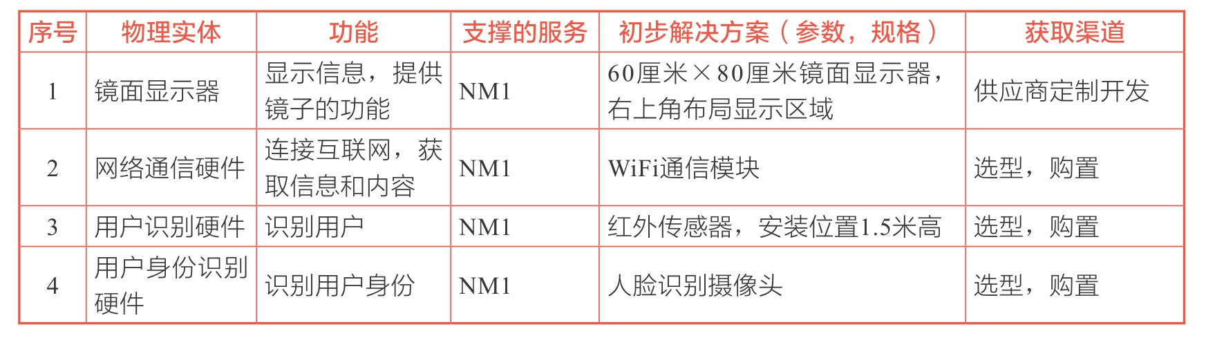 为了实现表2-1所示设计概念,系统开发所需的物理实体资源及其初步的解决方案如表2-3所示。此表用于系统交互设计师和负责系统硬件设计与开发的工业设计师、结构设计师、硬件开发工程师进行沟通,确定系统硬件的大致尺寸和初步的获取渠道。