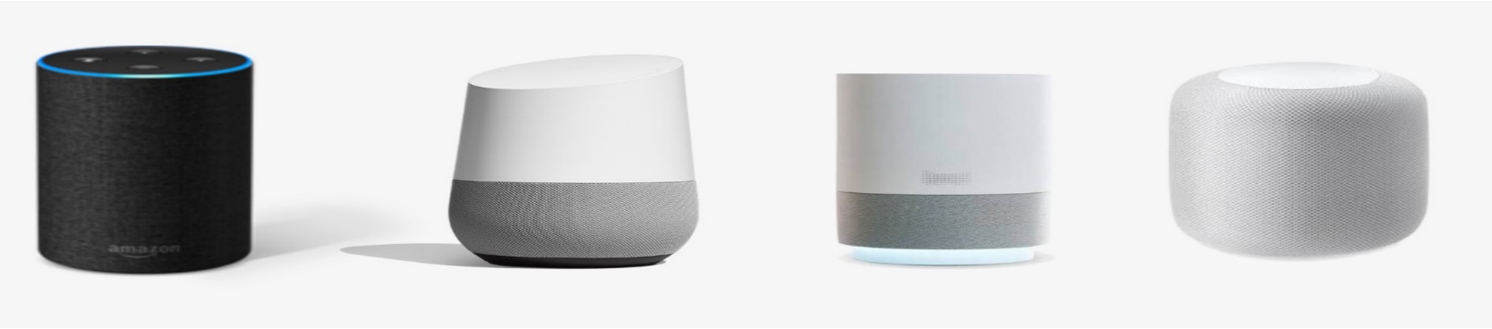 图1-24 智能语音音响(从左至右:Amazon Echo、Google Home、天猫精灵、Apple Homepod)
