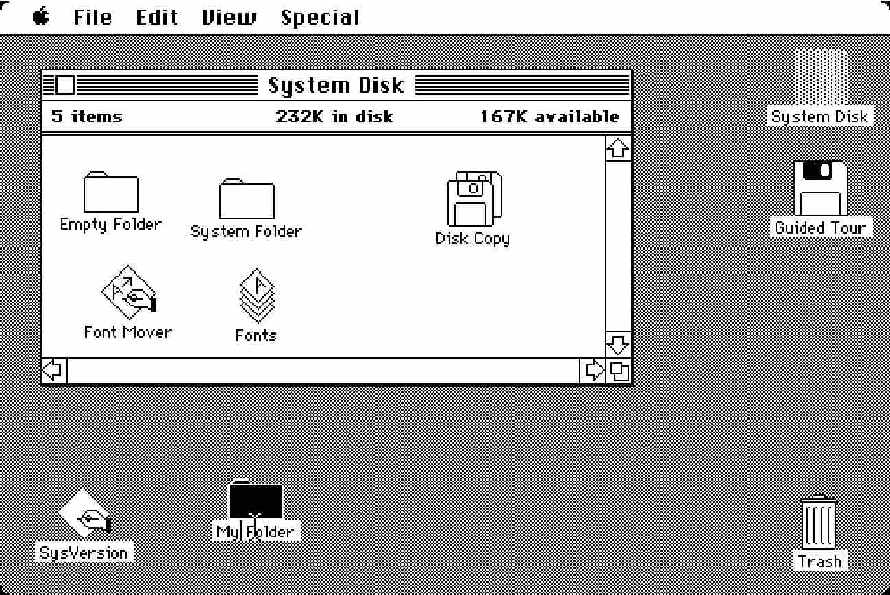 1983年1月,苹果公司结合硬件、操作系统、办公软件,设计出了强大的文件处理工作站Lisa。1984年苹果公司乘胜追击,发布了Macintosh I,如图1-15所示,它已经有了现代操作系统的一些特点,当插入磁盘时可以直接在桌面上看到,方便存取文件。双击磁盘图标,打开一个文件窗口,同时伴随着缩放效果。文件和文件夹都可以被拖曳到桌面上,也可以通过拖曳来复制或移动文件。默认状态下,文件夹以图标方式查看,还可以根据文件大小、名字、类型或日期来排序,通过单击图标下面的名字可以输入新名称来对文件重命名。到1987年,苹果发布Macintosh II,即第一代彩色操作系统,支持24位颜色显示。