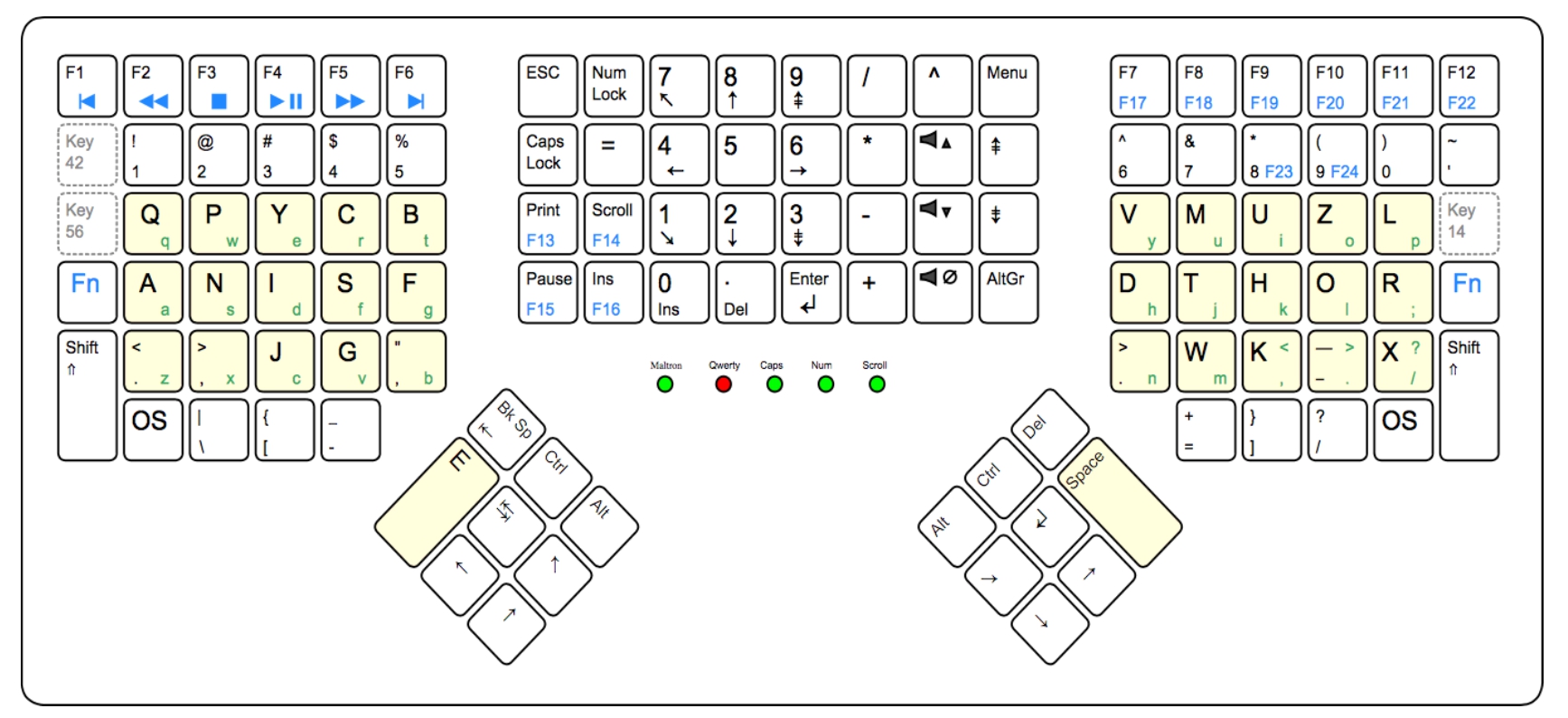 比Dvorak键盘更加合理、高效的是理连·莫尔特(Lillian Malt)发明的MALT键盘(图1-9)。它改变了原本交错排列的字母按键,为拇指分配了更多按键,也使“后退键”(Backspace)及其他原本远离键盘中心的键更容易触到。但MALT键盘需要专用的附件才能安装到计算机上,所以也没有得到广泛应用。