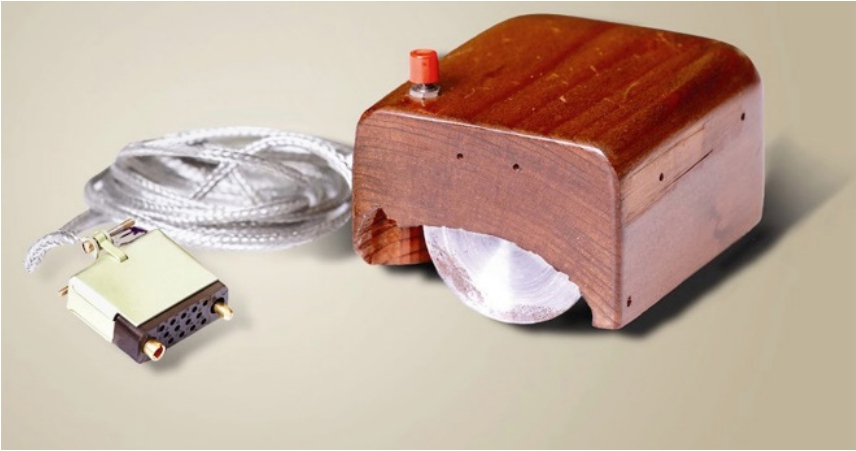1964年,加州斯坦福研究所的道格拉斯·恩格尔巴特(Douglas Engelbart)博士研究出了“显示系统X—Y位置指示器”,这是一个顶部设计有按键,拖着一条电线的小木盒子,非常像一只老鼠,道格拉斯和他的同事就称其为“Mouse”,该设备由此得名(图1-10)。在当时DOS操作系统中,鼠标并没有如今这样重要。受限于当时的硬件环境和操作系统,这一可以更改历史的发明并没有很快得到广泛应用。直到微软公司的Windows操作系统和各种版本的UNIX操作系统出现后,鼠标才逐渐应用于计算机的控制,这为计算机的操作带来了空前的便利。直到1973年,施乐(Xerox)推出了首款采用图形界面的操作系统——Xerox Star之后,鼠标才成为计算机的标配附件。
