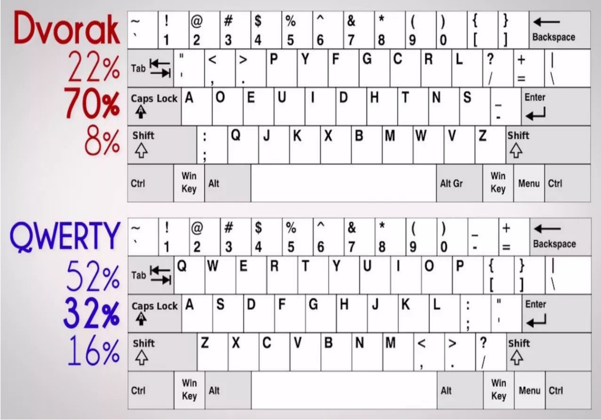 其实,使用QWERTY键盘的工作效率并不高。比如,大多数打字员惯用右手,但使用QWERTY键盘,左手却负担了大约57%的工作。两个小拇指及左无名指是最没力气的指头,却要频频使用它们。排在中列的字母,其使用率仅占整个打字工作的30%左右。因此,时常要为了打一个字而频繁移动手指。