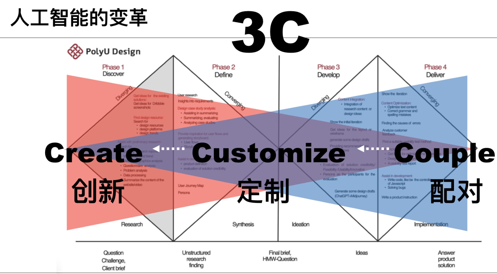 我发现当新技术出现时,新的模式也随之而来。我们有三个阶段,我称之为3C。首先是配对。你只是把技术应用到你现有的方法上。然后在使用生成程序一段时间后,你开始定制。最后会创造出全新的方法。今天已经有很多定制化的东西,但最终,我们需要做的是创造全新的设计方法或流程。