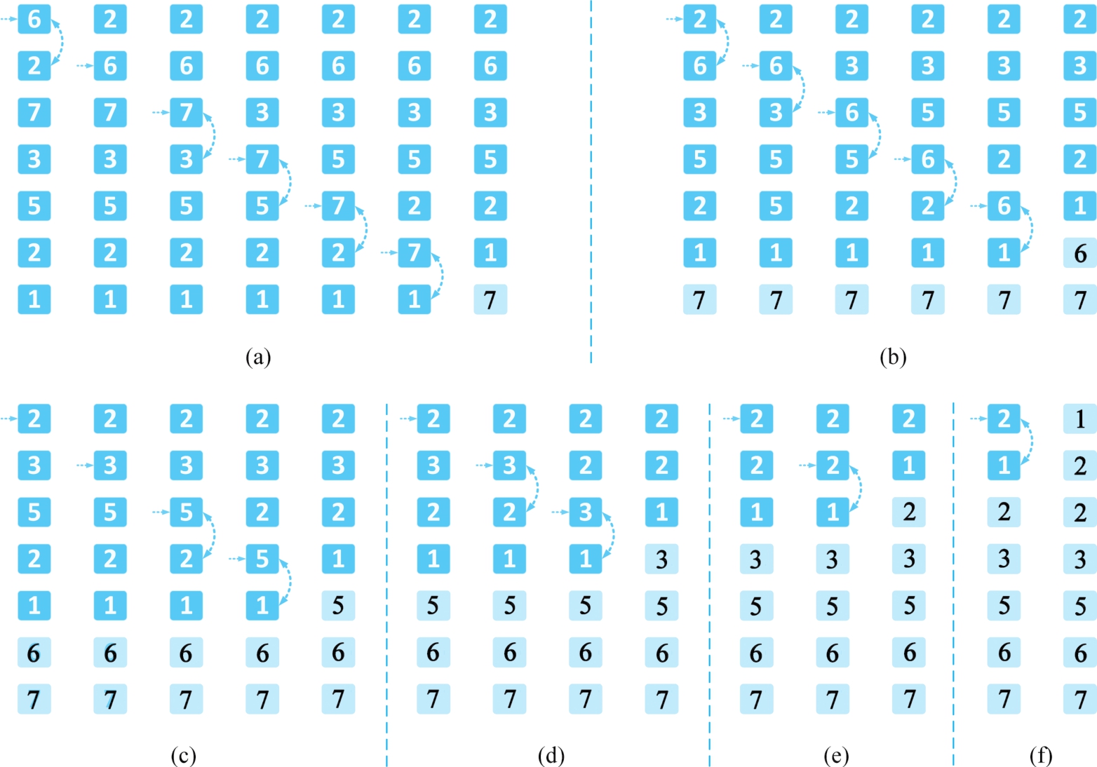 假定待排序的数据为{6, 2 ,7,3,5,2,1}(加粗用于标示相同关键字的先后顺序),7个元素最多需要进行6趟排序。排序的原则是将无序区较大元素进行交换,将交换后的无序区最大元素置于有序区的头部。