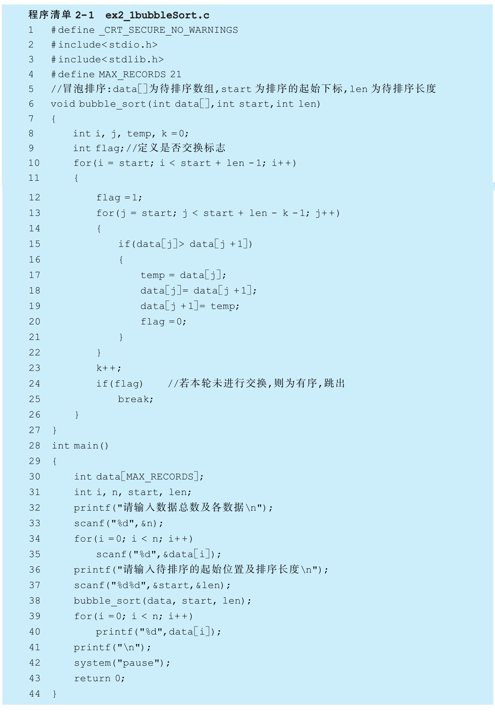 当某一趟排序过程中未进行任何交换时,说明数据已经全部有序,无须再进行下一趟排序过程。为此,函数中定义标志量flag,每趟循环设置其初值为1,若排序过程中发生交换则置其值为0。