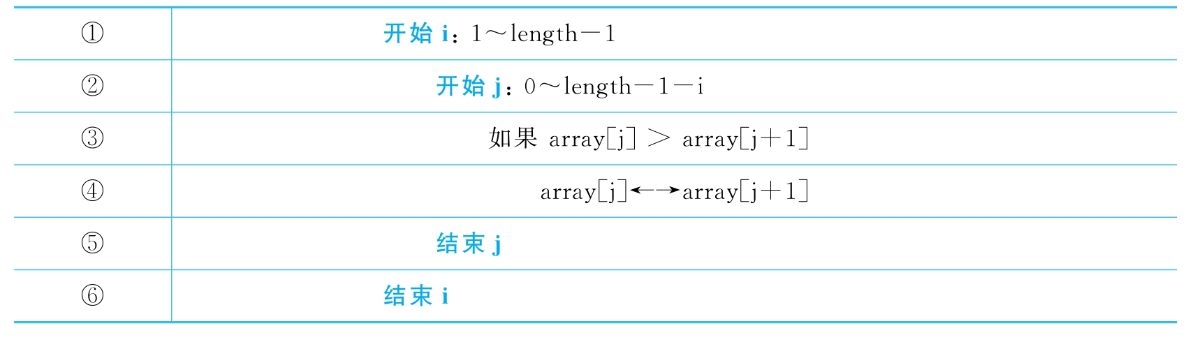 设待排序的无序序列存放于数组array中,长度为length,给出冒泡排序的伪代码如表2-1所示。