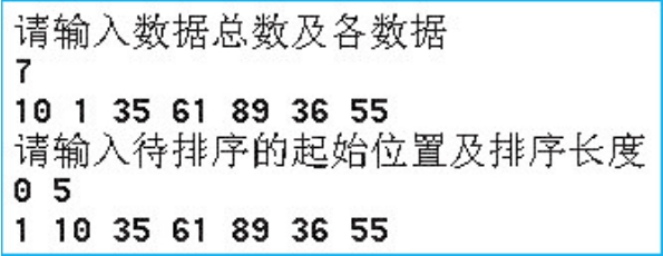 bubble_sort()函数包括有3个参数,data[]为待排序数组,start为排序区间的起始下标,len为待排序区间的长度。例如,对无序序列{10,1,35,61,89,36,55},从第0个位置开始的5个元素进行冒泡排序,结果应该为{ 1 , 10 , 35 , 61 , 89 ,36,55}。