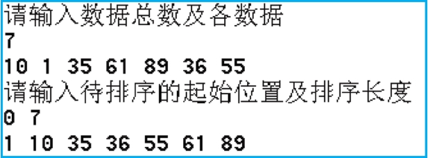 selection_sort()函数有3个参数,data[]为待排序数组,start为排序区间的起始下标,len为待排序区间的长度。例如,对无序序列{10,1,35,61,89,36,55},从第0个位置开始的5个元素进行选择排序,结果应该为{ 1 , 10 , 35 , 61 , 89 ,36,55}。