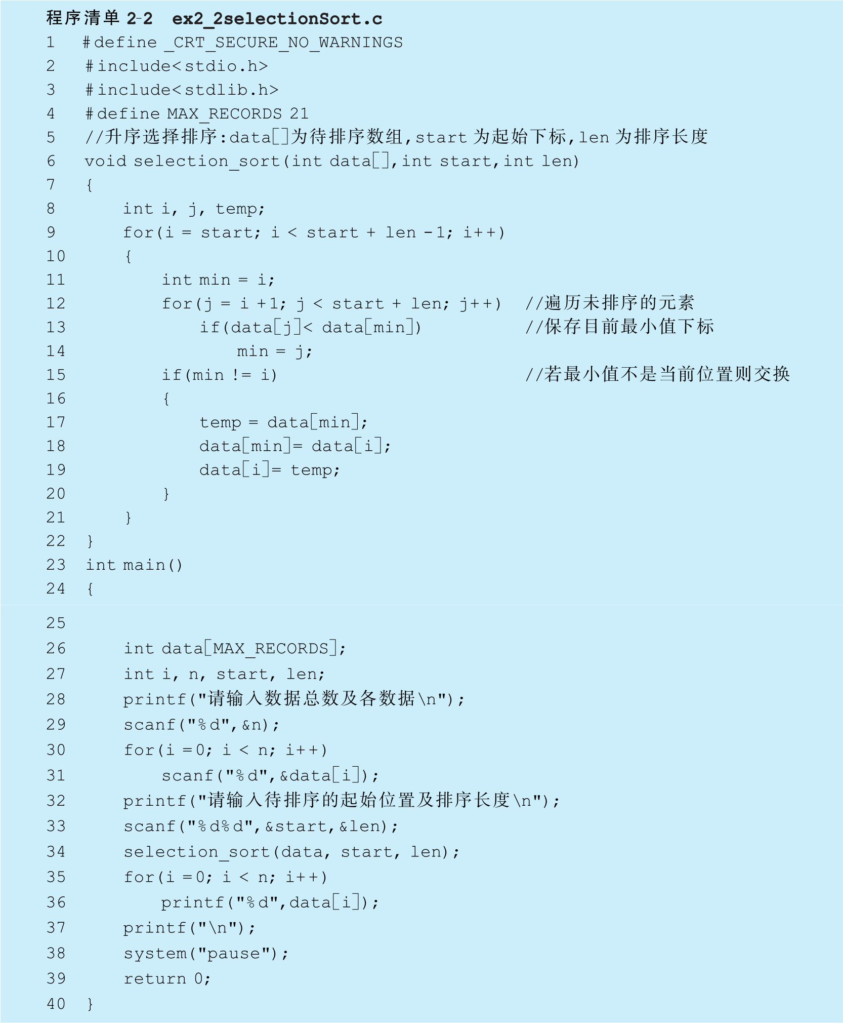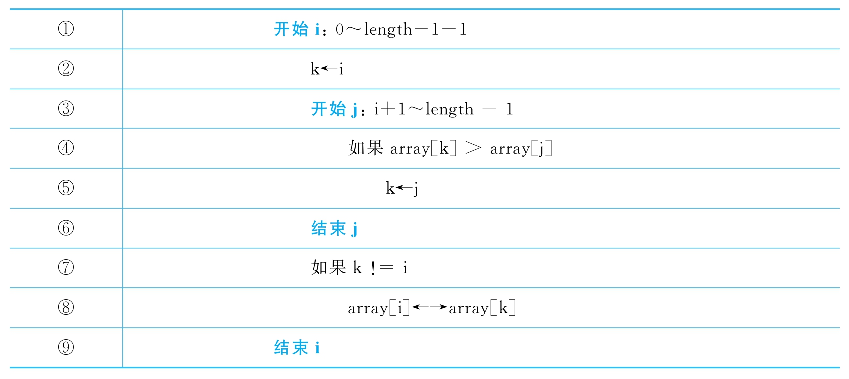 设待排序的无序序列存放于数组array[]中,长度为length,下面给出选择排序的伪代码,如表2-2所示。