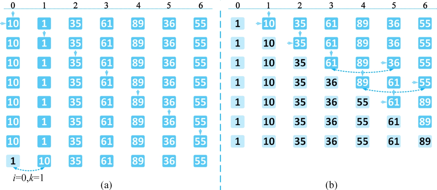 假定待排序的数据为{10,1,35,61,89,36,55},7个元素最多需要进行6趟排序。排序的原则是定位无序区中最小元素,将之与无序区首元素进行交换,将交换后的无序区首元素合并至有序区的尾部。
