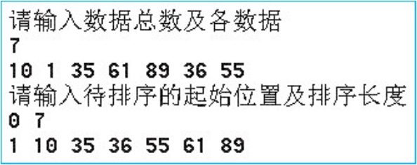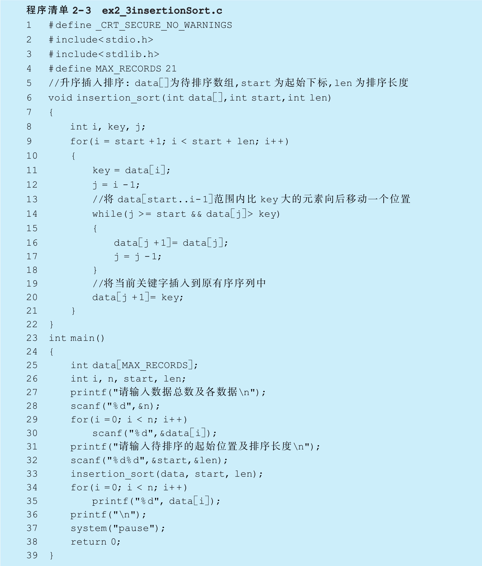 实现插入排序主体功能的是insertion_sort()函数,main()函数用于测试排序的效果。insertion_sort()函数可实现对部分序列进行排序,包括3个参数,data[]为待排序数组,start为排序区间的起始下标,len为待排序区间的长度。